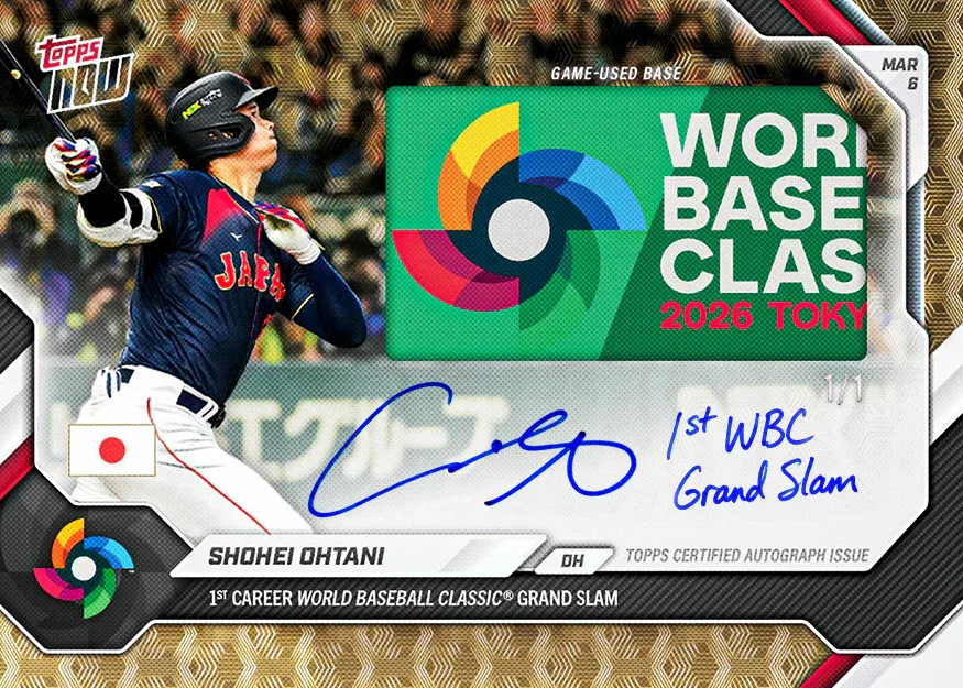 「Look for カード」には、大谷翔平のWBC初満塁ホームランを記念したホームランシーンのイメージバリエーションが登場。さらに、この試合で実際に使用されたベースを封入した1枚限定「1/1 レリックオートグラフカード」も制作された。このカードには、大谷翔平が “1st WBC Grand Slam” と書いたインスクリプションが入る非常に貴重な一枚となった。