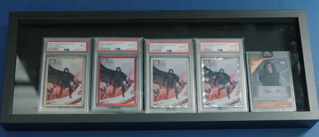 “The heart of my collection is my Kylo Ren and Princess Leia,” Garcia says. She’s currently chasing Kylo Ren’s Dark Order rainbow from 2023 Star Wars Chrome Galaxy (2023 Star Wars Chrome Galaxy #56 Dark Order). She’s methodically assembling the parallels—“the atomic refractor,” “the X-Fractor,” “the red color match,” and “the SuperFractor.”