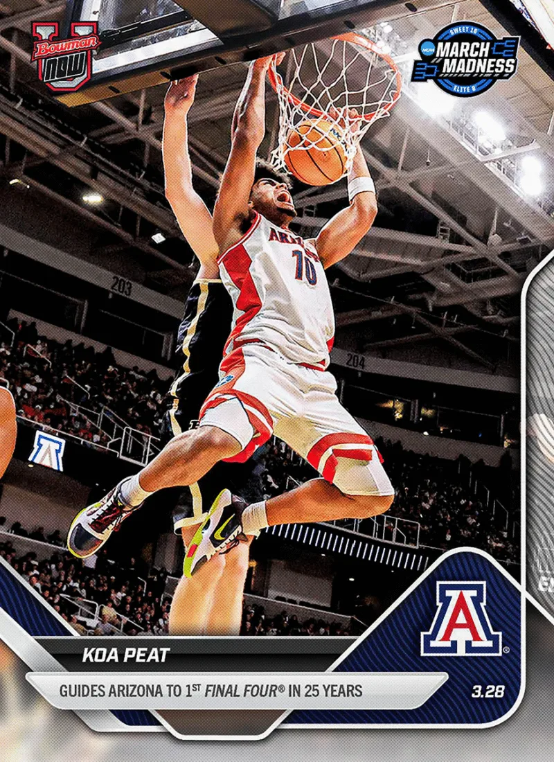 - Featured cards include Koa Peat of Arizona, Madison Booker of Texas, Agot Makeer of South Carolina, and the UConn Men’s Basketball team