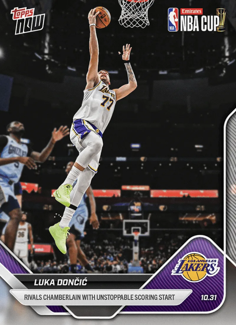 - The subset kicked off with a Luka Dončić Topps NOW card, featuring a midair finish under Cup lights with the Cup logo — setting the program’s tone for star-driven, tournament-branded moments