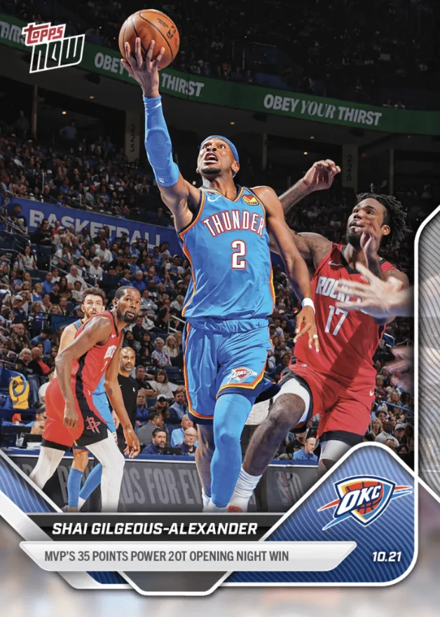 RIPPED’s NBA Topps NOW Player of the Night highlights the standout performance from the previous night’s NBA action, tying it directly to the Topps NOW card drop. Opening Night 2025–26 belongs to Shai Gilgeous-Alexander — his card is live now on Topps NOW for a limited time only.