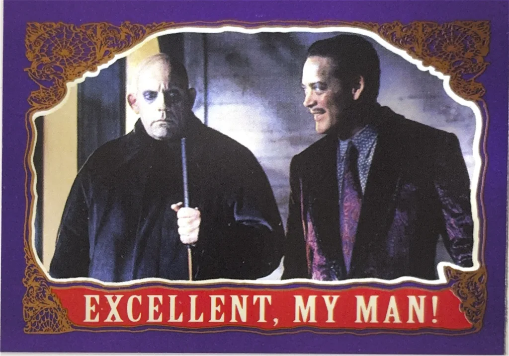 I look back on this movie fondly, but the card set is sadly unspectacular. There’s a very cool ivy/tree border, and the back has the same vibrant color patterns as the Gremlins 2 cards.