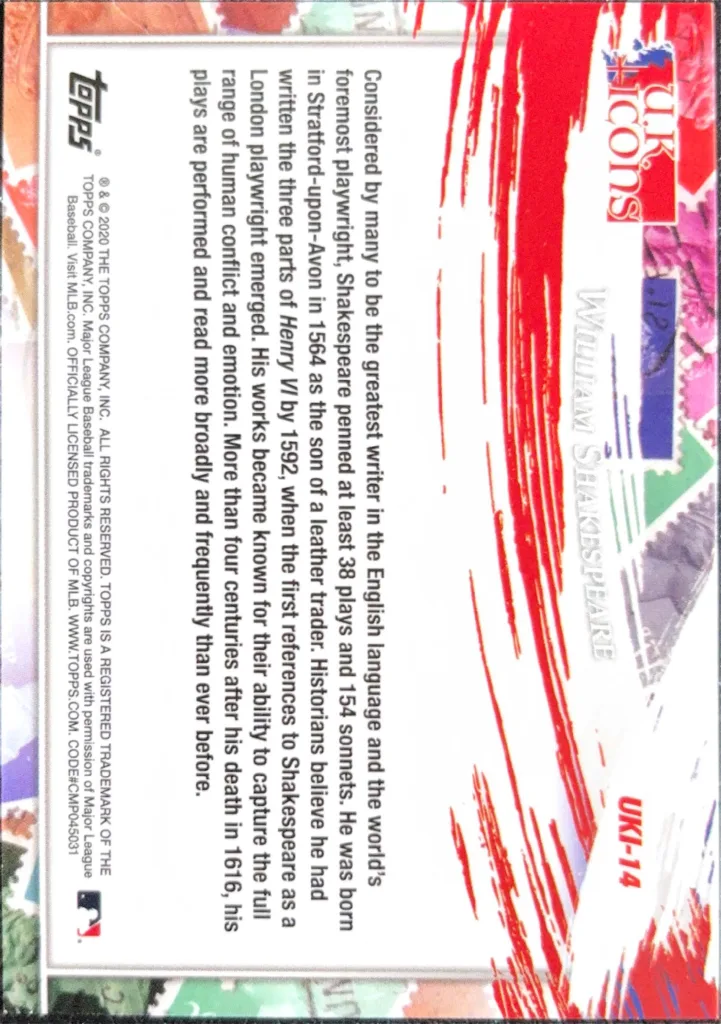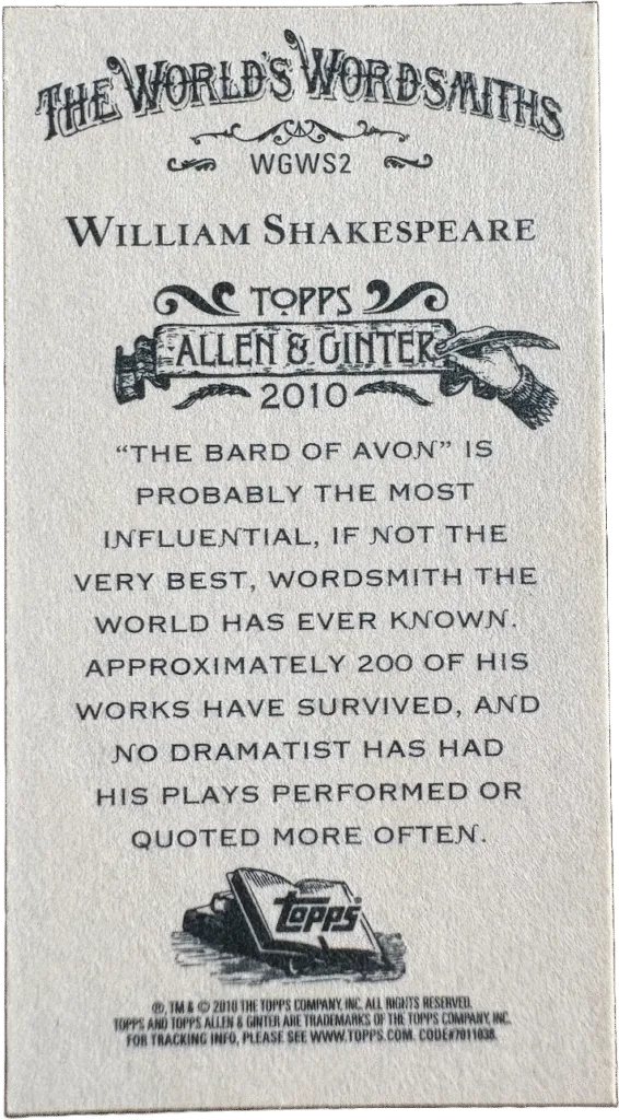 - Shakespeare cards can be fun additions to a non-sports or pop culture collection, especially aligned with other cards of historical figures like Topps Allen & Ginter.