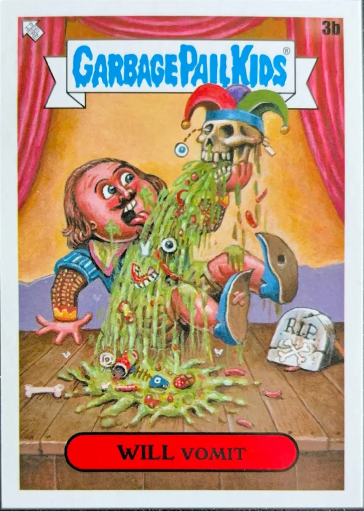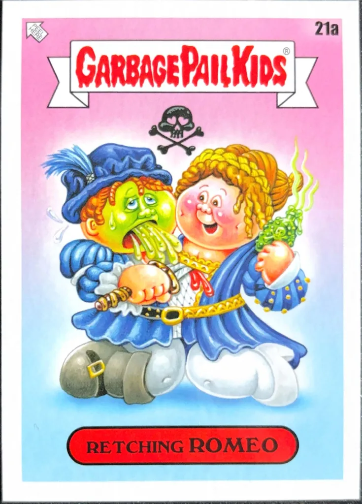 The GPK Bookworms set, which featured the brilliant “Winnie the Pooper” entry, has two Shakespeare-related entries, one in the “Authors of Their Own Misfortune” subset (“Jake Speare” and “Will Vomit”), and another playing on the Bard’s most famous romantic tragedy with “Retching Romeo” and “Jabbed Juliet.”