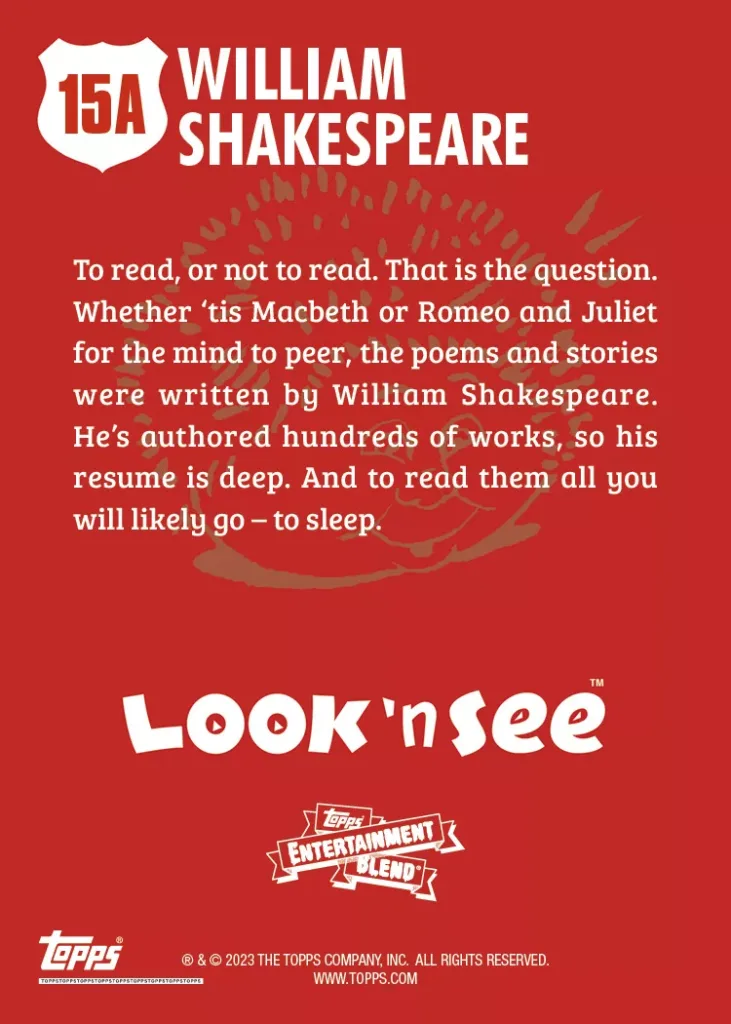 April 23 is William Shakespeare’s birthday. In honor of the Bard, we take a look back at some of his many appearances across different Topps card releases, from Garbage Pail Kids to Allen & Ginter.