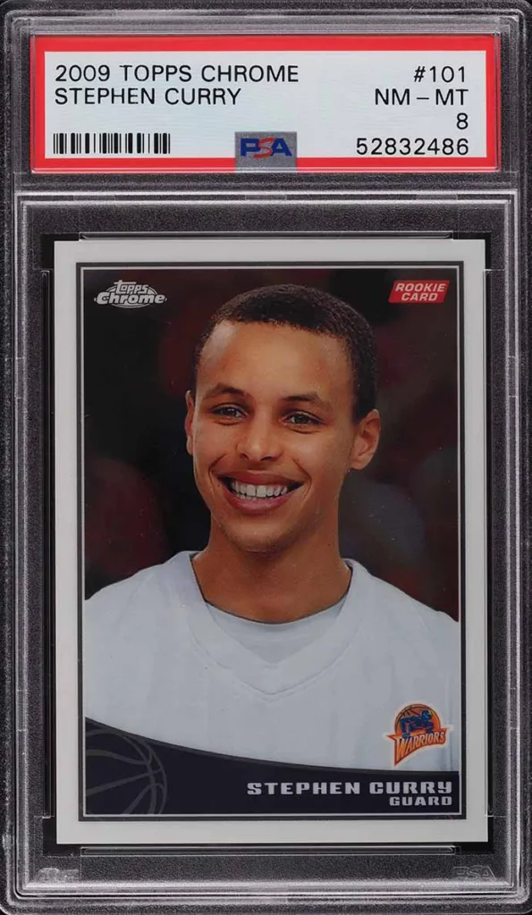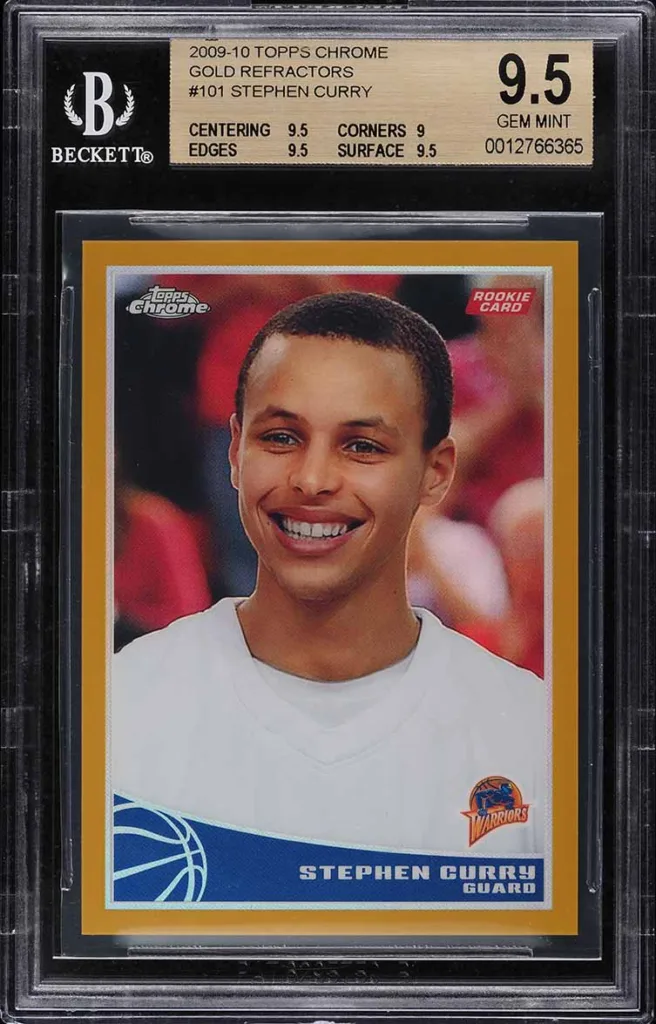 Curry’s 2009-10 Topps Basketball RC is another major chase card for collectors. The Black version numbered to 50 sold for $90,000 on September 25, 2025 through Fanatics Collect. Both RC’s feature the same player image of a smiling Curry. The base version of the Topps Basketball RC has a PSA population of 371 PSA 10 and 1,567 PSA 9.