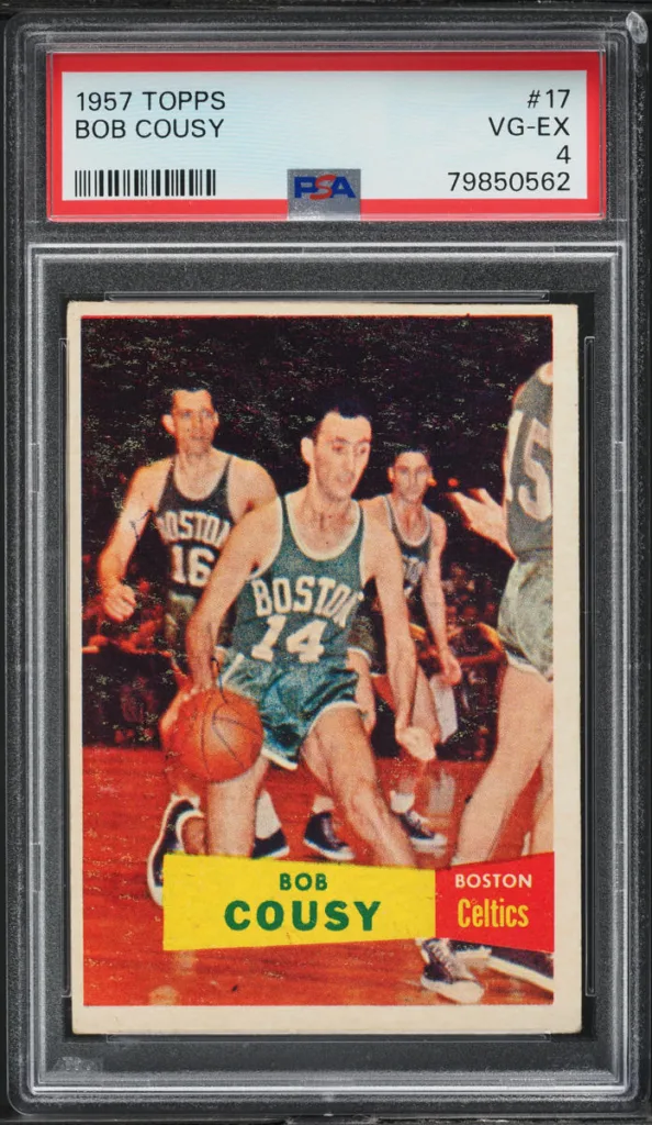 In true Cousy fashion, his 1957-58 Topps card shows him dribbling and looking for an open teammate.