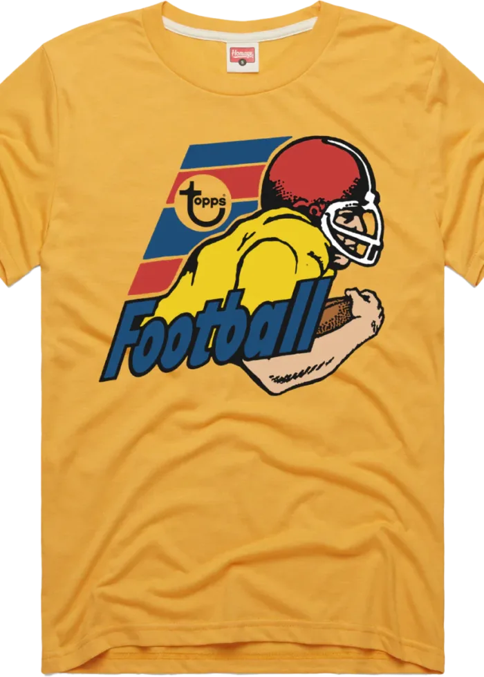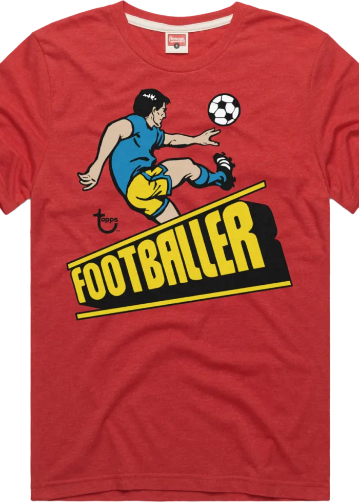 The Topps Football Pro League Yellow Tee and Topps Footballer Pro League Red Tee extend card-inspired graphics across sports, pairing nostalgic visuals with modern tri-blend comfort.