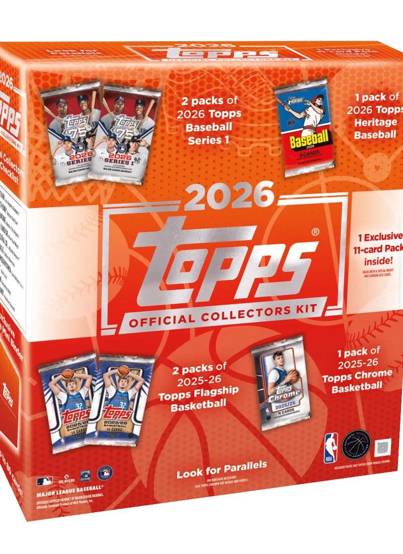 - The Kit includes packs from 2026 Topps Series 1 Baseball, 2026 Topps Heritage Baseball, 2025-26 Topps Chrome Basketball, and 2025-26 Topps Basketball.