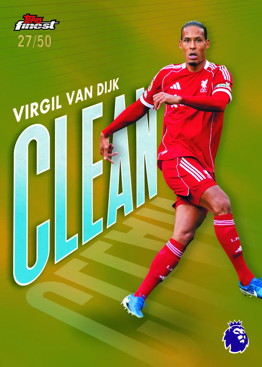 Other subsets to chase include the subtle yet brilliant Clean, which brings eye-catching typeface to a great list of stars. From classy center-back Virgil van Dijk to the imposing Lewis Dunk, towering Dan Burn, and speedy Micky van de Ven, this insert celebrates the league’s best defenders.