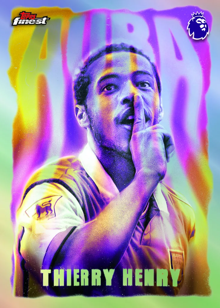 Aura is an insert all about presence. These are the players who have the “It” factor. Thierry Henry, Roy Keane, Didier Drogba, Bukayo Saka, and more all appear on these case-hit cards that demand attention.