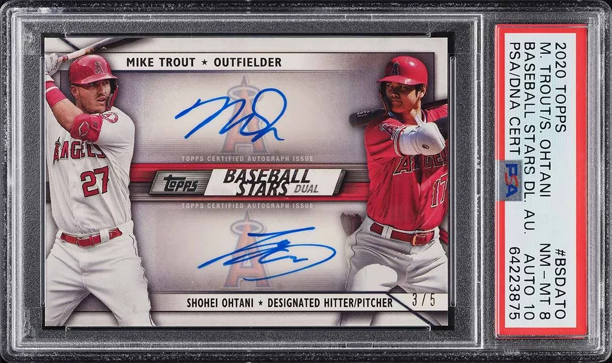 Speaking of standard-bearers, this 2020 Baseball Stars Dual Auto card features the one who passed the torch to the other. Former teammates Mike Trout and Shohei Ohtani co-star here — two MVPs, two otherworldly talents, two leading lights of MLB and The Hobby.