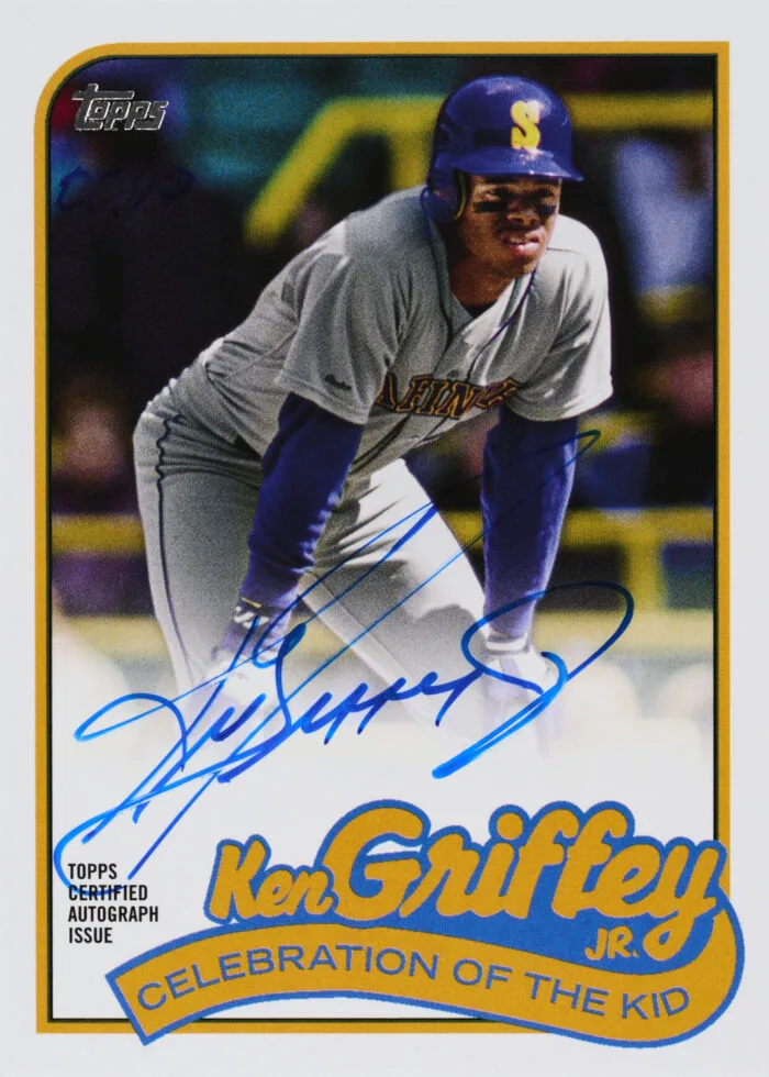 2024 Topps Series 1 Baseball featured the Celebration of the Kid insert, including chase-worthy Griffey Jr. autos. While there are plenty to choose from, this card, featuring an image from his 1989 rookie season, is a standout. It features an image of a young Griffey Jr. on his way to mesmerizing baseball fans for a generation.