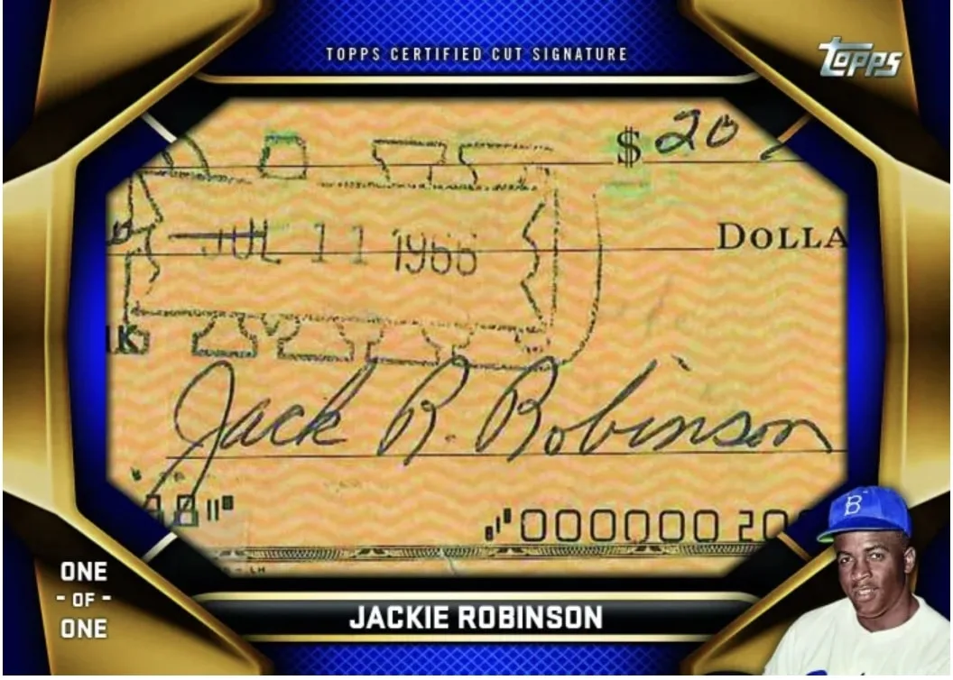 This Jackie Robinson cut signature feels as much a historical artifact as it does a baseball card. Robinson’s signature deservedly commands reverence among collectors across generations. The one-of-one features a signature from a check — complete with a bank stamp ‘PAID’ and a phenomenal auto.