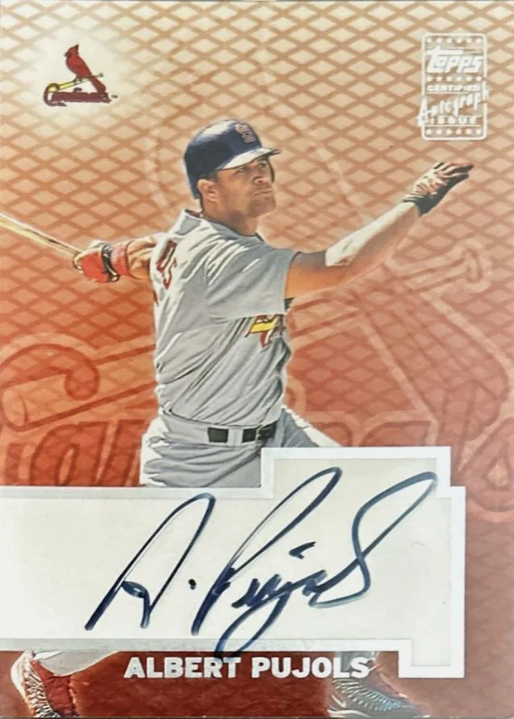 A Pujols autograph in 2003 Topps Series 1 Baseball captures a young star already playing like a superstar. ROY in 2001 and an MVP runner-up in his sophomore campaign, the Pujols Phenomenon had its grip on the sport and The Hobby in 2003. this card features a clean but compelling player image set against the logo of the franchise he would define for a decade.