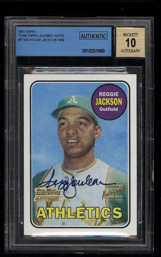 This 2001 Team Topps Legends reprint of Reggie’s 1969 Oakland A’s card (of which an original PSA 10 once sold for over $1 million) puts Reggie’s pen to a Hobby classic. It’s an auto for the ages on a reprint of Reggie’s most iconic card.