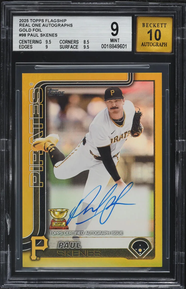 This Gold Foil Auto numbered to /50 explodes out of the hand. The combination of the action image showing that Skenes delivery, surrounded by a Gold parallel that fits as a brilliant Pittsburgh Pirates color match, this one’s a beauty. This BGS 9 version of the card sold for $870 in November 2025 through Fanatics Collect.