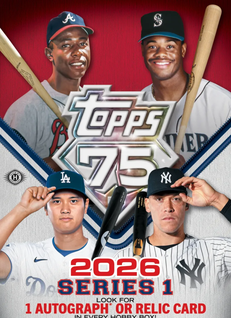 The 2026 Series 1 cover celebrates baseball across generations. By bringing together Hank Aaron, Ken Griffey Jr., Shohei Ohtani, and Aaron Judge, Topps created a visual bridge between the game’s past and present. It honors enduring greatness while recognizing the sport’s continued evolution.