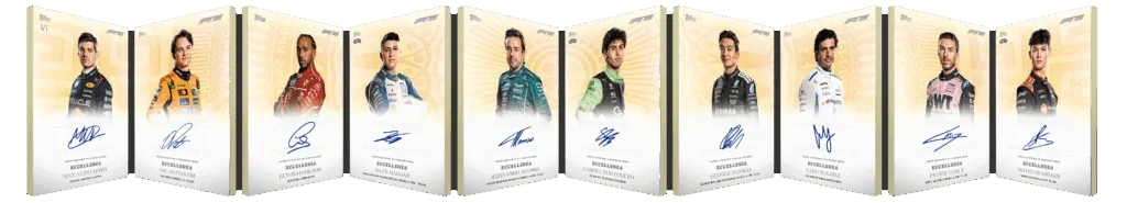 The ultimate chase for 2025 is the all-new ‘Fresco’ card — a ten-panel autograph booklet featuring one driver from each F1® team. A true centrepiece, and the only one of its kind.