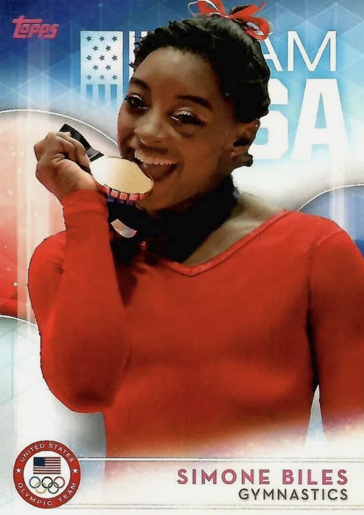 Topps also documented the rise of gymnast Simone Biles, who made her Topps debut in 2016 in the U.S. Olympic Team set, including autographed versions and a Gold Rainbow one-of-one. The image of Biles biting her gold medal became iconic, capturing a defining moment as it happened.