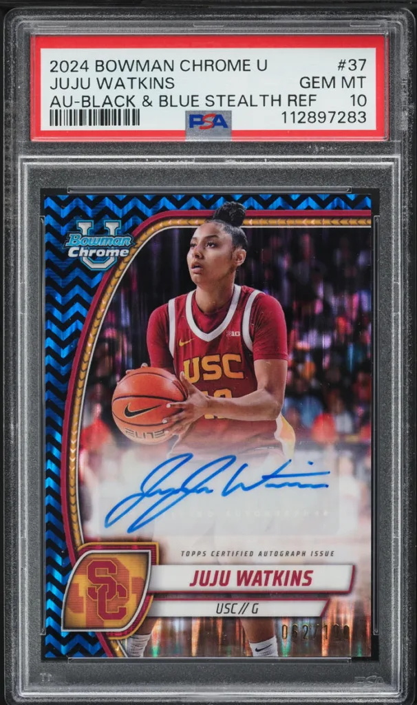 With Clark now established at the professional level, the likes of Bueckers and heir-apparent JuJu Watkins of USC should keep the momentum surging. Watkins made her debut in the 2022–23 Bowman Chrome University set, as well as in the 2023 Topps Chrome McDonald’s All-American set, both featuring autographed versions.