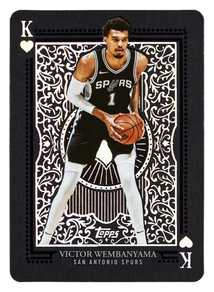Wemby’s entry in the popular All Kings insert leads off the 25-card subset, and it’s a fitting chase card of the kid who just might become king. The player image, featuring Wemby in his Spurs uniform, creates an intriguing sort-of-color-match with the playing card background.